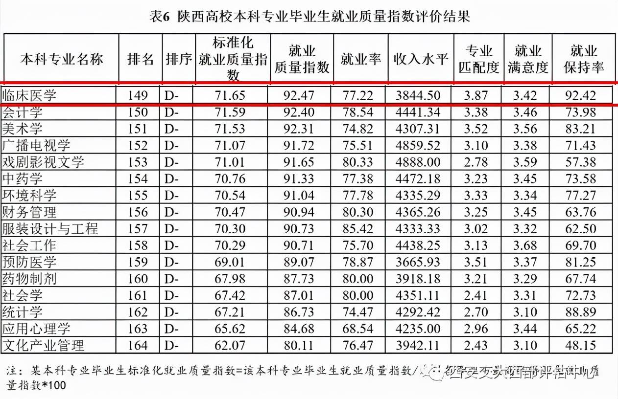 2019年陕西大学生就业质量报告中,临床医学位于D-类专业,毕业生就业质量不佳。