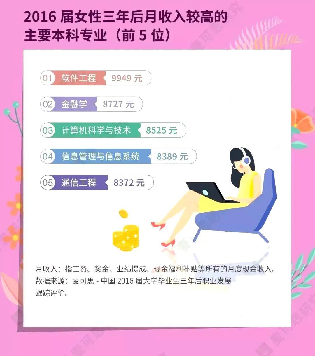 而在最近麦可思发表的女性三年后月收入排行中,软件工程专业的女性毕业生3年后月平均收入也很理想,更不用说男性了。