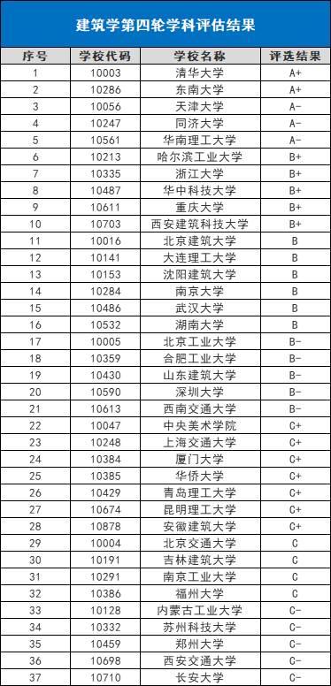 其次就是通过了全国高等院校建筑学专业教育评估的高校,2017年第四轮建筑学学科评估结果对考生们填报志愿也有很大的参考价值,具体如下: