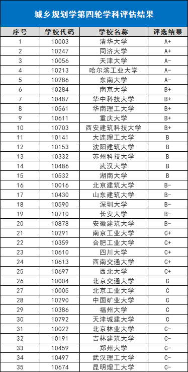 第四轮城乡规划学学科评估结果如下: