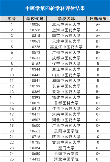 全国第四轮中医学学学科评估结果如下: