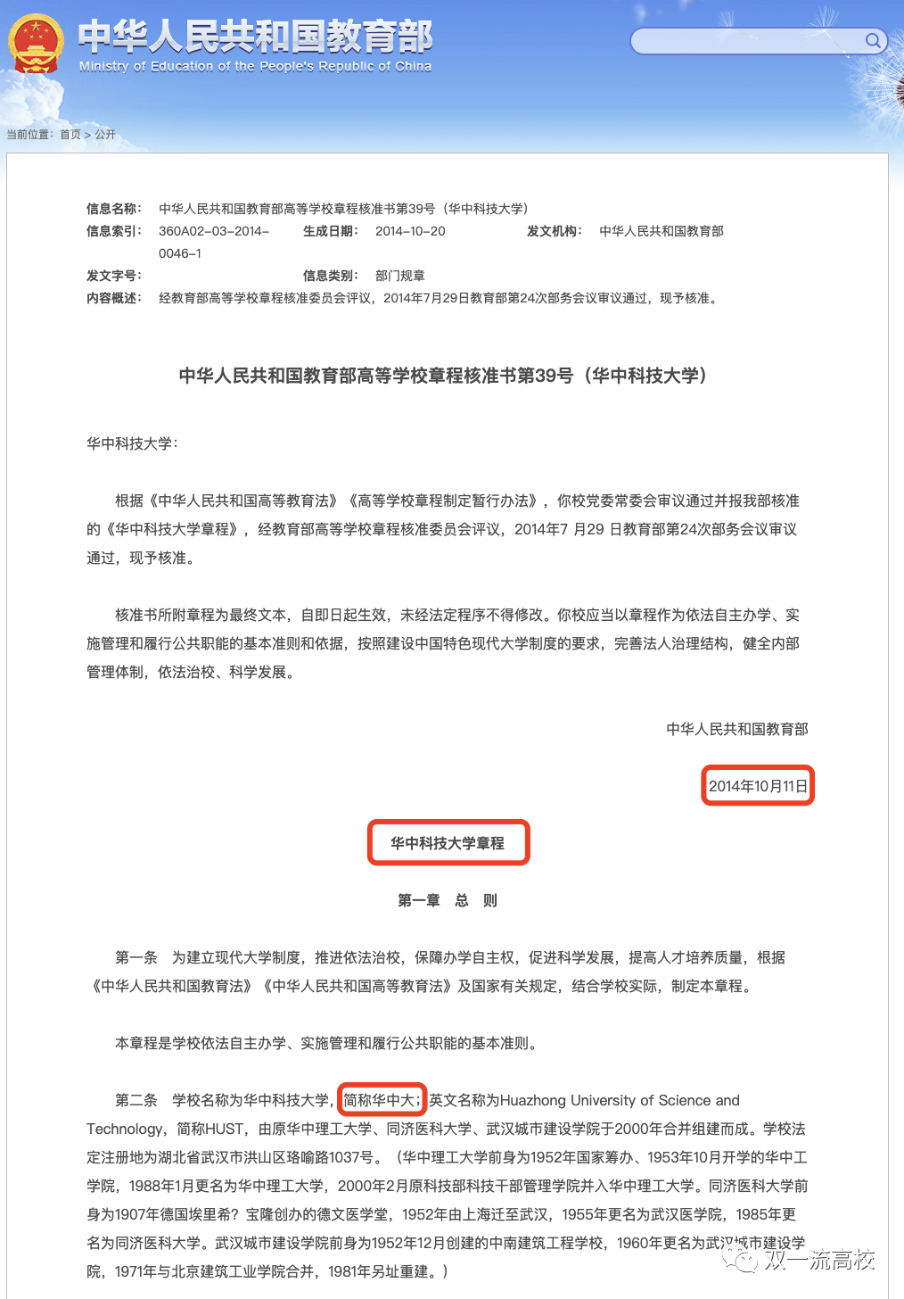 8月31日,教育部网站发布消息,同意华中科技大学章程部分条款修改,其中包括将“学校名称为华中科技大学,简称‘华中大’,修改为“学校名称为华中科技大学,简称华中大、华科大”。增加条款还包括:“校歌为《华中科技大学校歌》。”
