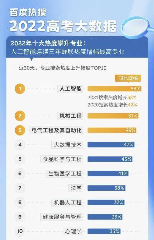 相比去年,人工智能、机械工程、电气工程及其自动化、大数据技术、食品科学与工程、生物医学工程、法学、机器人工程、健康服务与管理、心理学等专业热度涨幅不断攀升。(图01所示)