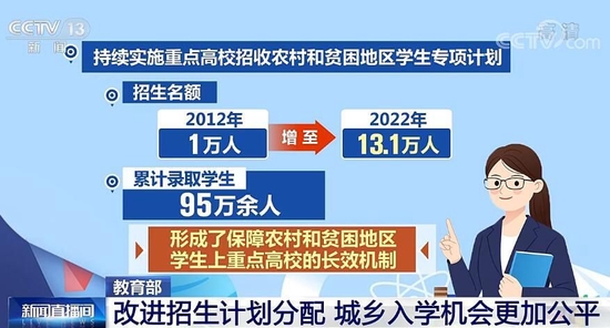据介绍,持续实施重点高校招收农村和贫困地区学生专项计划,招生名额从2012年的1万人增至2022年的13.1万人,累计录取学生95万余人,形成了保障农村和贫困地区学生上重点高校的长效机制。