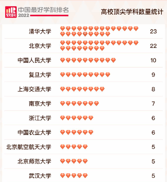 中国顶尖学科数量,清华、北大遥遥领先,人大位列第三