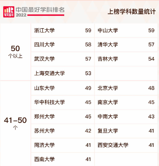 按照上榜学科数量统计,浙江大学和中山大学各有59个学科上榜,领先国内其它高校,四川大学紧随其后,拥有58个上榜学科,清华大学、武汉大学、吉林大学、上海交通大学的上榜学科数也都超过50个。