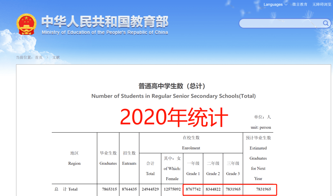 根据教育部公布的普通高中在校学生人数统计来看,2020年高一年级(2022年应届高考生)人数为8767742人,但实际2022年高考报名人数为1193万人。