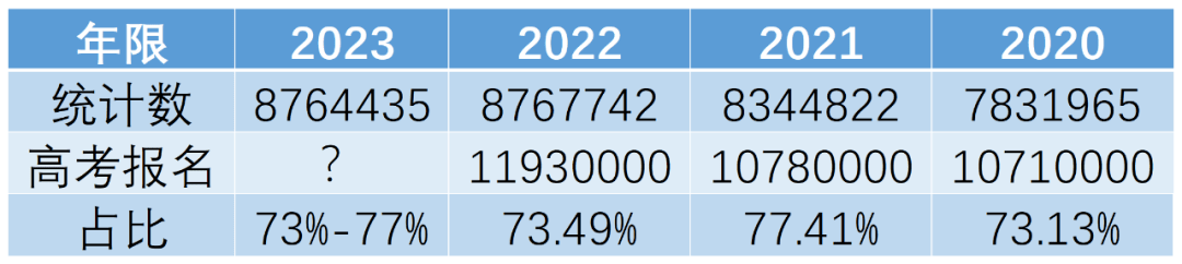 统计人数只是报名人数的73%,剩下的27%的人从哪里来的呢?其实这里面还包含了对口招生、高职单招(中职生的高职高考)、复读等人数。