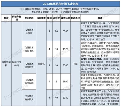 目前,经教育部批准的开设飞行技术专业(本科),并已在民航招飞系统开通账号的招飞院校有20所。其中,上海工程技术大学、中国民用航空飞行学院、北京航空航天大学、中国民航大学、南京航空航天大学等5所高校2022年在沪投放飞行技术专业招生计划,2023年在沪招飞院校及细则暂未公布,请相关考生关注。