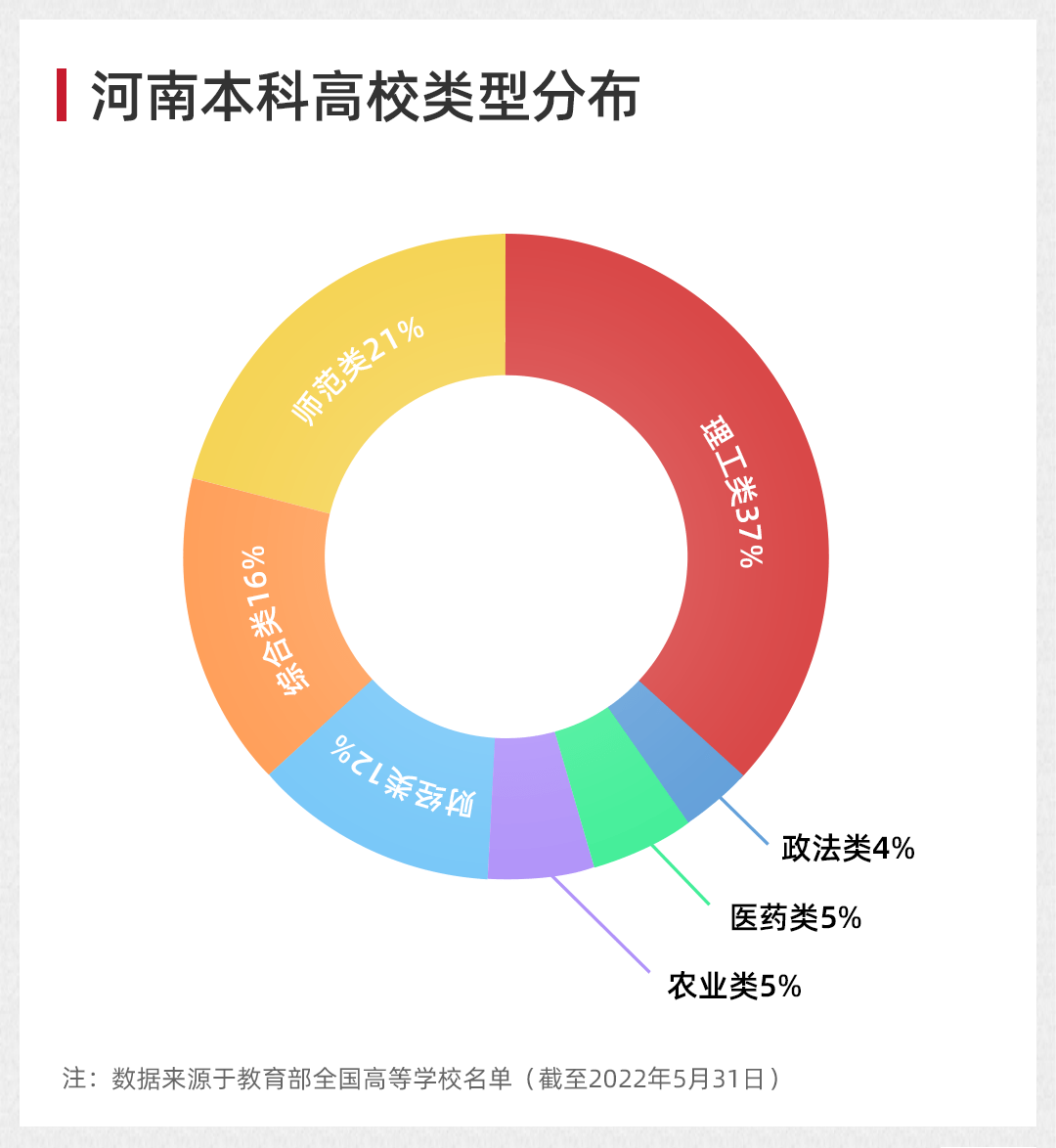 从高校类型来看,河南高等教育的短板则更加突出。57所本科高校中,理工类、师范类高校占比过半。除综合类大学外,财经类、农业类、医药类、政法类等特色高校屈指可数。语言、体育、艺术等领域更是一片空白。