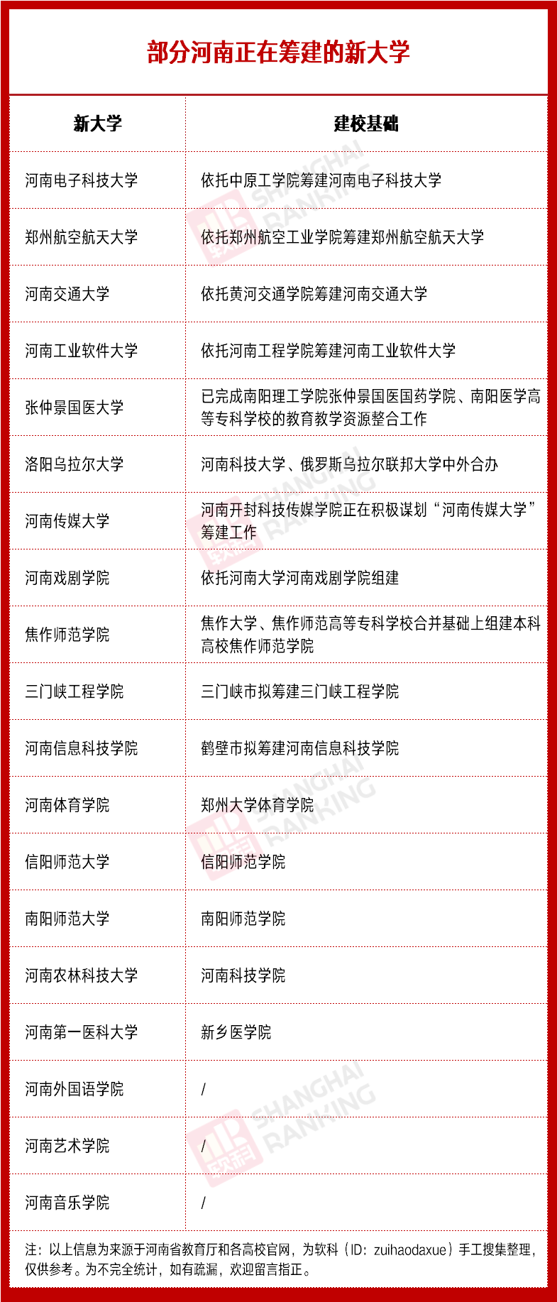 另外,三门峡市、鹤壁市两地也传出筹建本土本科院校的消息。9月30日,三门峡工程学院(筹)暨职教园区建设工作领导小组第一次会议召开。市长范付中强调,筹建三门峡工程学院和职教园区建设是市委、市政府深入贯彻习近平总书记关于建设教育强国重要论述,全面落实省委创新驱动、科教兴省、人才强省战略,奋力建强省际区域中心城市、打造国家创新型城市而作出的一项重要决策部署。要高端定位,结合国家中部地区崛起、晋陕豫黄河金三角区域合作规划、黄河流域生态保护和高质量发展等战略部署,建设高水平应用型本科院校。河南信息科技学院也在加紧筹备中。今年8月,鹤壁市举行《河南信息科技学院筹建方案》专家论证会。会上,专家组认为,鹤壁市本科院校筹建方案思路清晰,总体目标明确,规划全面系统,近中期建设规划合理。学院设置是大力实施省委创新驱动、科教兴省、人才强省第一战略,贯彻落实省第十一次党代会精神,优化调整区域高等学校布局,推动高等教育高质量发展和助力区域经济社会发展的重要举措和必然要求,填补了河南省电子信息类应用型本科高校和鹤壁市本科院校的空白,十分必要。