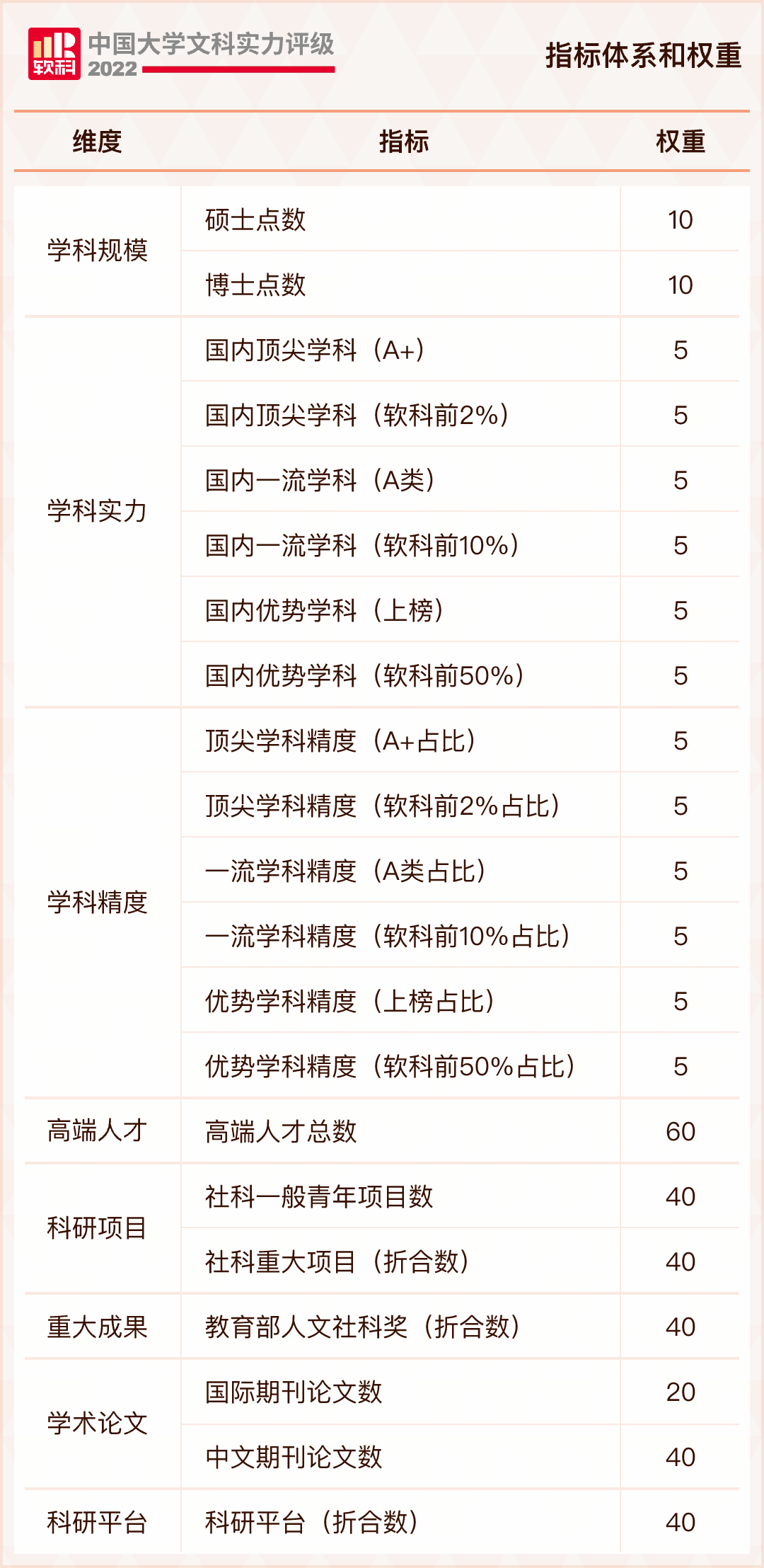 中国大学文科实力评级包含学科规模、学科实力、学科精度、高端人才、科研项目、重大成果、学术论文和科研平台8个维度。