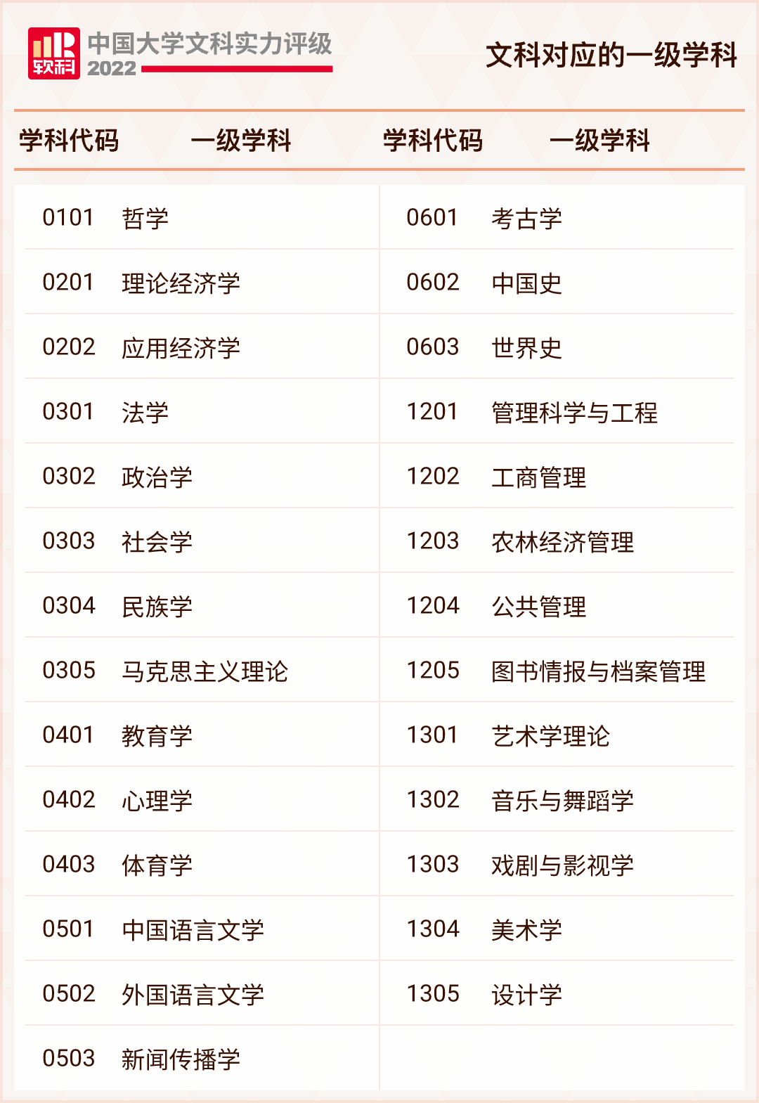 中国大学文科实力评级的对象为所有被纳入2022软科中国大学排名的高校。文科的范围包括8个学科门类的27个学科,具体如下: