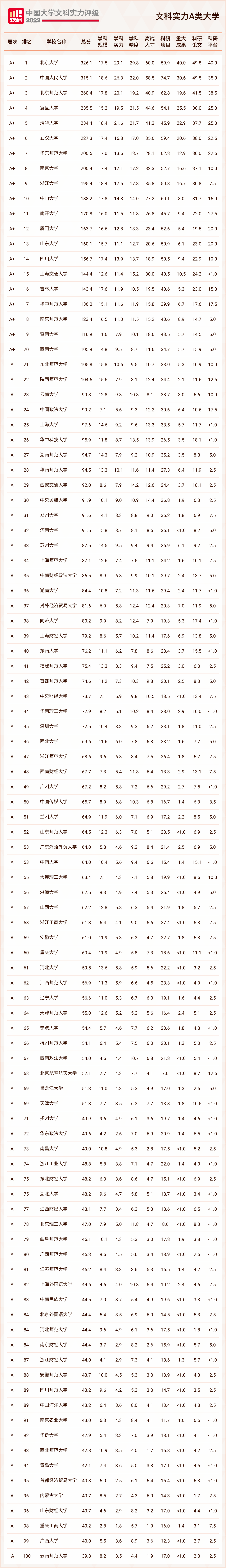 中国文科实力A大学:文科实力全国21~100名(相当于文科领域有得分高校的2%~10%)。