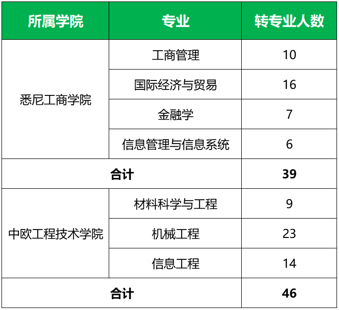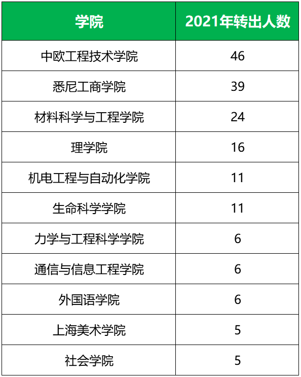 可以看到,中欧工程技术学院(转出46人)、悉尼工商学院(转出39人)等学院在2021年的专业转出人数合计将近100人,数量相当可观。