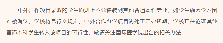 放眼全国,目前允许学生从中外合办专业转到普通专业的,很可能只有上海大学。当然,小车也留意到个别开设中外合办专业的高校,对于这类转专业的有关界定是相对模糊的,如重庆医科大学的临床医学专业(中外合作项目),具体说法如下: