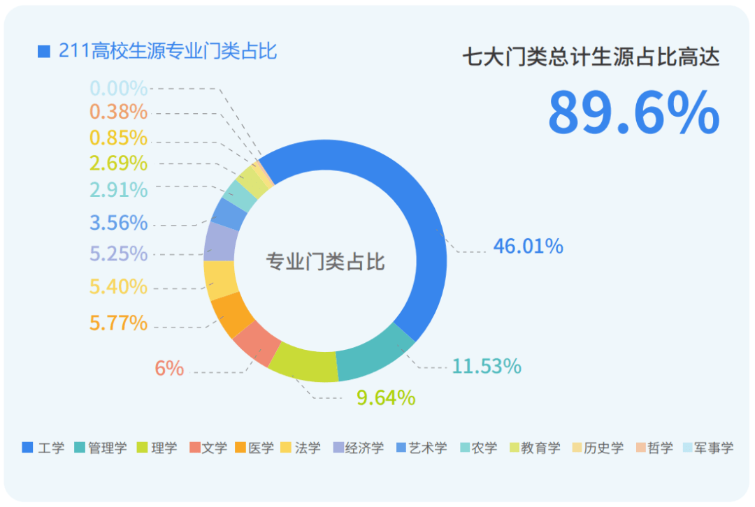 211高校毕业生源数排名前七位的专业门类分别是:工学、管理类、理学、文学、医学、法学、经济学。这七大门类总计生源数占比高达89.6%,也是211大学的人才供应核心主体。