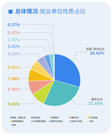 2021届211高校毕业生签约企业单位占比为总生源数的36.96%,事业单位、党政机关和国企的签约生源占总生源数的44.92%,民营企业、其他企业的签约生源则只占到总生源数的29.42%。