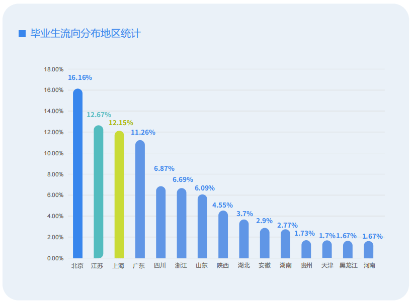 在211高校发布的就业报告就业单位地域分布,就业人数最多的10个省份(直辖市、自治区)中,北京16.16%,江苏12.67%、上海12.15%分别位列总生源的前三。