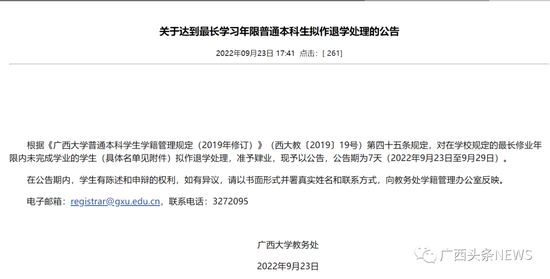 据中国新闻社消息,2022年9月23日,广西大学发布《关于达到最长学习年限普通本科生拟作退学处理的公告》和《关于超学习年限研究生拟予以退学处理的公告》。对在学校规定的最长修业年限内未完成学业的67名本科生拟作退学处理,准予肄业。拟对超学习年限无法毕业或结业的86名研究生(其中博士研究生1人,硕士研究生85人)予以退学处理。