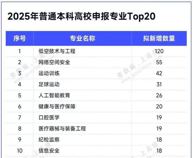 20个大学专业上榜。在这份榜单中,共计20个专业进入榜单,上榜专业既包括传统热门专业的口腔医学、临床医学、中医学等,也包括近年新兴专业的低空技术与工程、纪检监察、游戏艺术设计等。经过不完全统计,上榜专业高校开设数量在9个-120个不等。其中,低空技术、网络空间安全、运动训练居榜单前3名,新增高校数量分别为120个、55个、42个,是高校拟新增数量较多的大学专业。