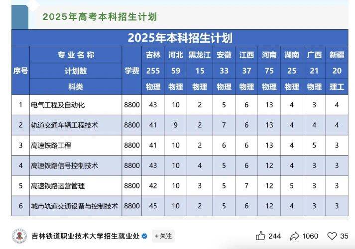 2025年,学校只在吉林、河北、黑龙江、安徽、江西、河南、湖南、广西、新疆9个省市区有本科招生计划,2026年其余省市区或许也会投放本科招生计划。