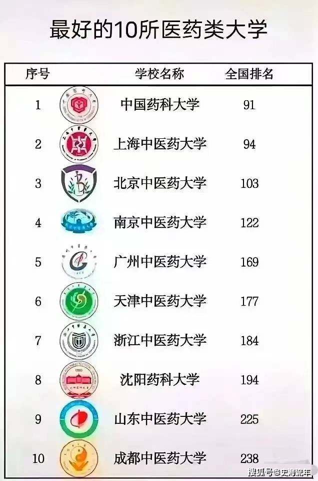 其中,排名第一的是中国药科大学,211大学,全国第一轮和第二轮“双一流建设高校”,在全国高校排名中名列第91位。排名第二的是上海中医药大学,“双一流建设高校”,在全国排名第94位。